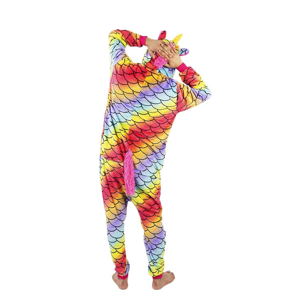 Кигуруми Единорог Хамелеон отличается ярким дизайном и красочной расцветкой. Он сшит из мягкой, с небольшим ворсом ткани, которая практически не мнется. Принт имитирует чешую. Креативное оформление подчеркивается объемным декором: хвостиком сзади, большим рогом и ушками на капюшоне, пушистой розовой гривой. На животе есть белая вставка.