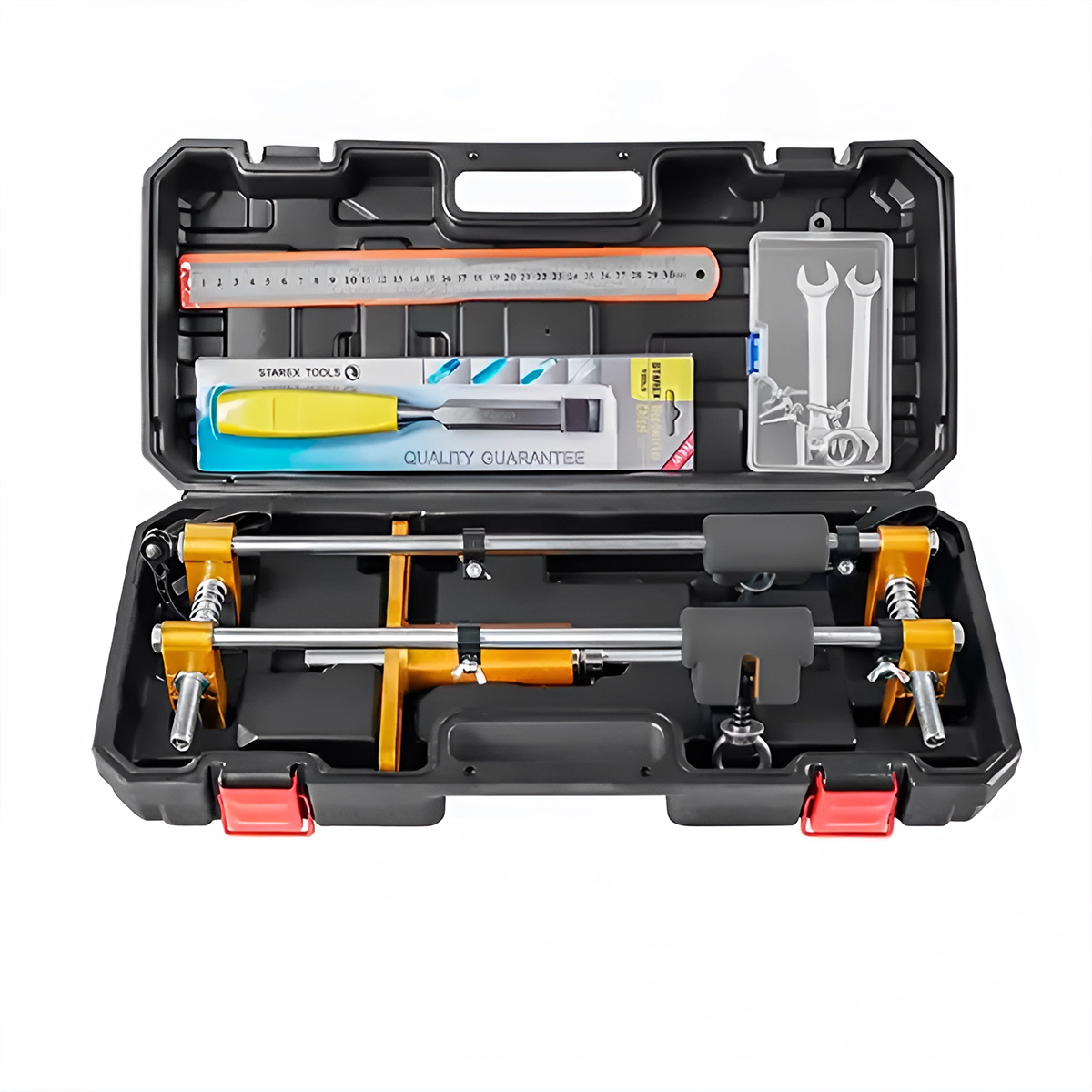 Комплектация включает в себя кондуктор, восемь фрез, стопорное кольцо для точной фиксации, набор рожковых ключей для регулировки, металлическую линейку для точного измерения, стамеску для подготовки поверхности, а также пластиковый кейс для удобного хранения и транспортировки всего инструментария.