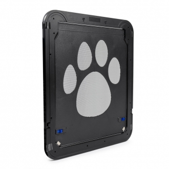 Пластиковая дверь для собак мелких и средних пород с серой рамкой и дверцей с полупрозрачными вставками. Шарнир дверцы позволяет ей свободно открываться в обе стороны, но предусмотрена возможность блокирования открытия в одну или обе стороны. Дверь изготовлена из высококачественного пластика и легко моется.