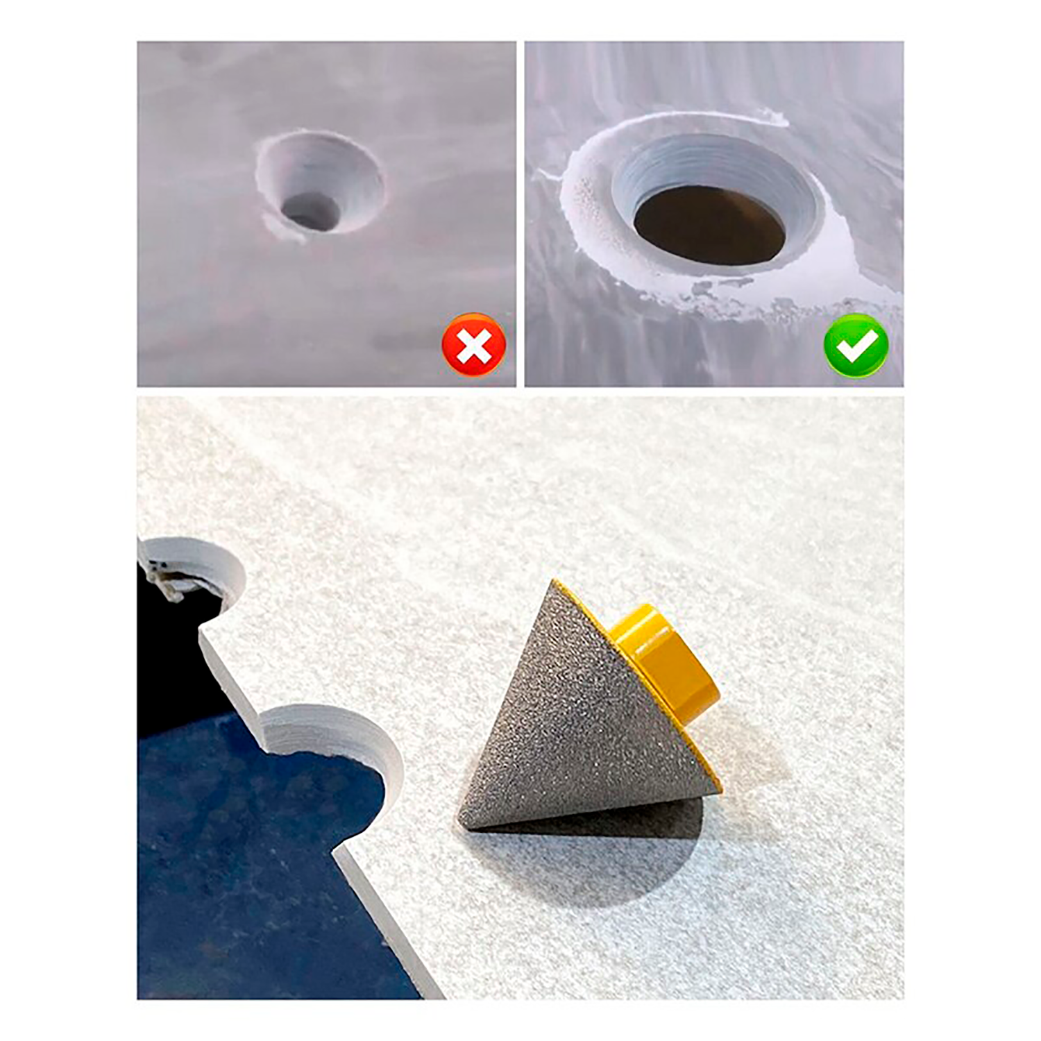 Эта алмазная насадка может обрабатывать грубые отверстия на стекле, граните, мраморе, камнях, керамической и фарфоровой плитке.