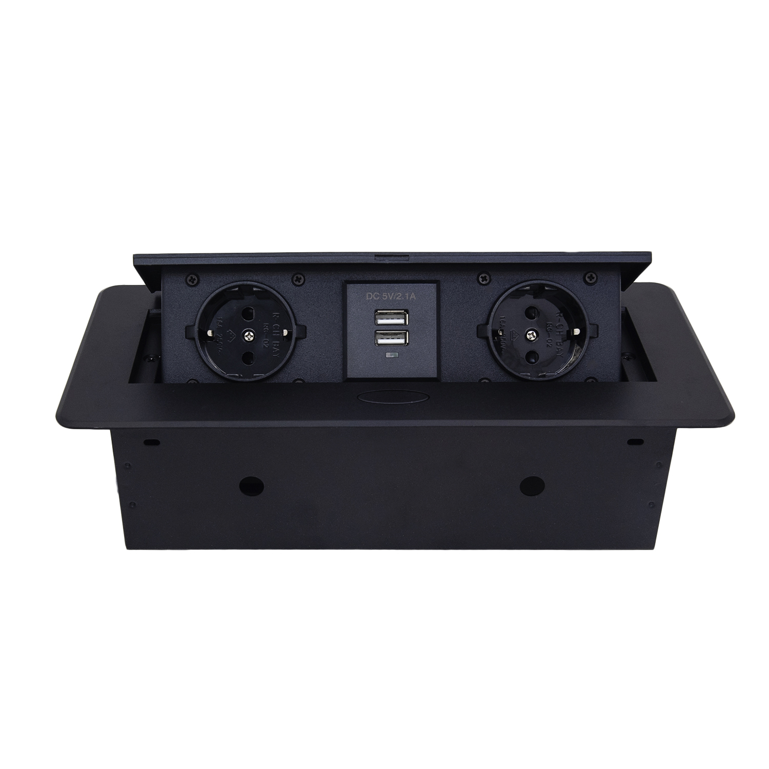 Розеточный блок для врезного монтажа со шнуром подключения длиной 1,5 метра. В блоке расположены две розетки на 220В с заземляющими контактами и два порта USB. Суммарная электрическая мощность нагрузки составляет 2700Вт.