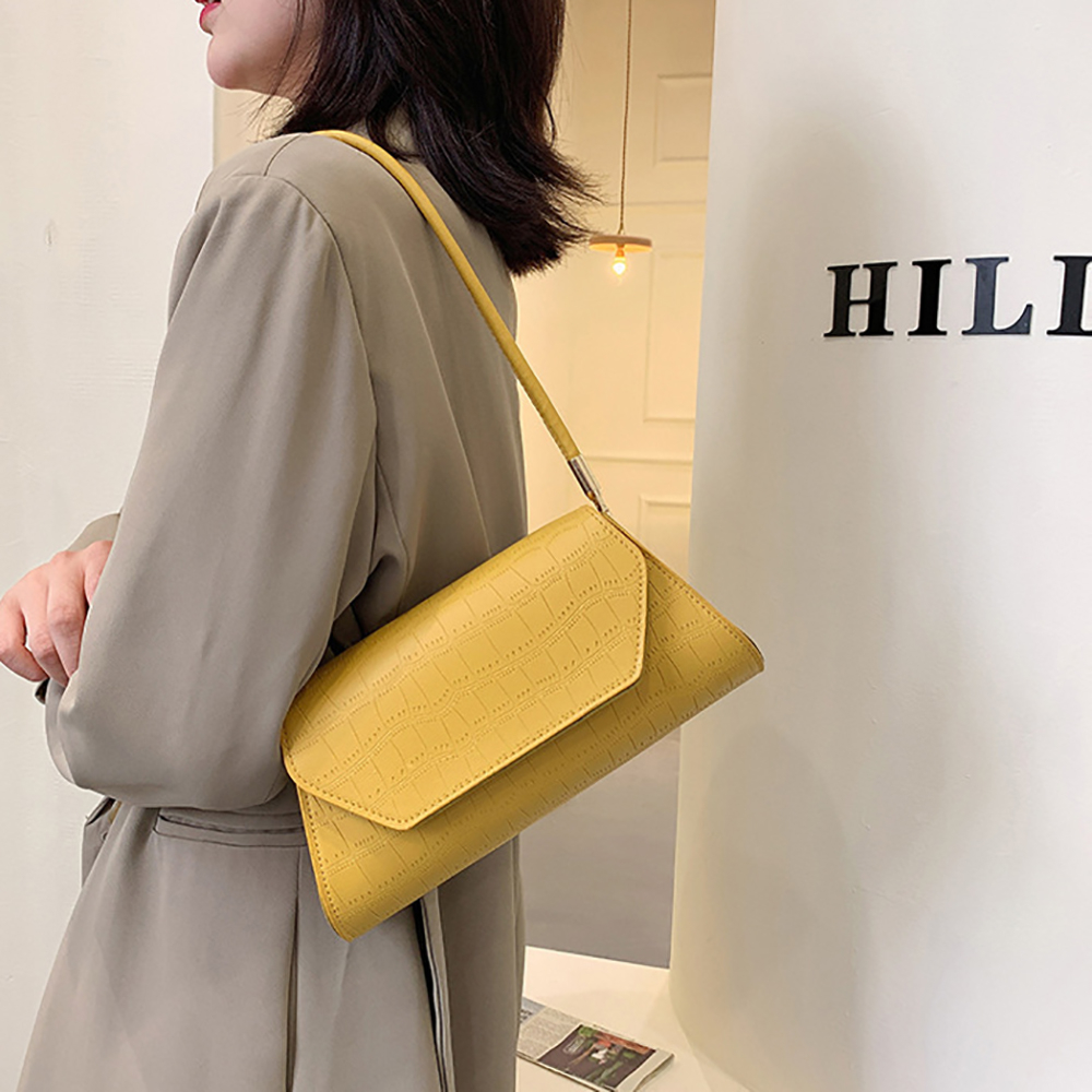 Сумка-багет женская Stella желтая в форме трапеции – идеальный вариант для выхода на праздничные мероприятия и ежедневной носки. Сумка женская выполнена из белой экологической кожи, которая не требует особого ухода. Мягкая экокожа хорошо переносит холод и жару, не трескается в минусовую температуру, не выцветает под действием ультрафиолета и не боится дождя или снега. Сумка через плечо имеет прочный каркас, поэтому не теряет своей формы. Клапан застегивается на магнитные замки. Длина ручек не регулируется. Прочная хлопковая подкладка не разрывается из-за острых предметов. Внутри сумки-багета есть объемный отсек и небольшой кармашек на молнии для мелочей.